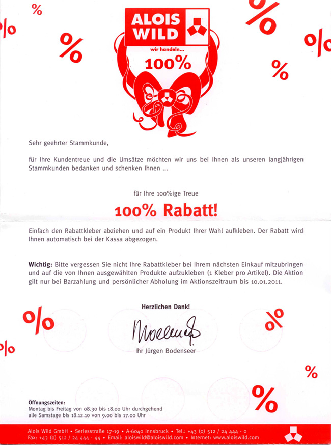 Jürgen Bodenseer – ein ganz schlechter Rechner oder ein gerissener Trickbetrüger? [26.12.2010]![]() ![]() Zweimal 20, zweimal 15 und dreimal 10 Prozent Rabatt ergeben bei sieben (gleich teuer) eingekauften Waren zusammen gerade einmal 14,28 Prozent Rabatt. Mehr über den bodenlosen Bodenseer: hier |