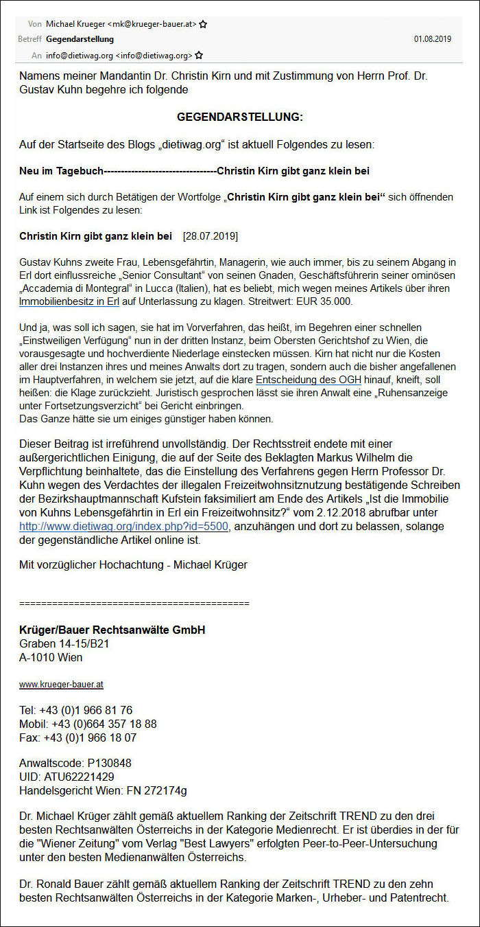 | Christin Kirn gibt ganz klein bei [28.07.2019] Gustav Kuhns zweite Frau, Lebensgefährtin, Managerin, wie auch immer, bis zu seinem Abgang in Erl dort einflussreiche „Senior Consultant“ von seinen Gnaden, Geschäftsführerin seiner ominösen „Accademia di Montegral“ in Lucca (Italien), hat es beliebt, mich wegen meines Artikels über ihren Immobilienbesitz in Erl auf Unterlassung zu klagen. Streitwert: EUR 35.000. ![]() Krüger, Kirn, Kuhn bei einem anderen Prozesstermin am Landesgericht in Innsbruck Und ja, was soll ich sagen, sie hat im Vorverfahren, das heißt, im Begehren einer schnellen „Einstweiligen Verfügung“ nun in der dritten Instanz, beim Obersten Gerichtshof zu Wien, die vorausgesagte und hochverdiente Niederlage einstecken müssen. Kirn hat nicht nur die Kosten aller drei Instanzen ihres und meines Anwalts dort zu tragen, sondern auch die bisher angefallenen im Hauptverfahren, in welchem sie jetzt, auf die klare Entscheidung des OGH hinauf, kneift, soll heißen: die Klage zurückzieht. Juristisch gesprochen lässt sie ihren Anwalt eine „Ruhensanzeige unter Fortsetzungsverzicht“ bei Gericht einbringen. Das Ganze hätte sie um einiges günstiger haben können. ![]() Aus dieser Gegendarstellung ergibt sich bereits, dass • Frau Dr. Kirn ihren mit Klage geltend gemachten Anspruch nicht mehr weiter verfolgen und Das freundliche Angebot, die Mitteilung von der Einstellung des Ermittlungsverfahrens gegen Gustav Kuhn (und nur gegen Gustav Kuhn) an den szt. Artikel anzuhängen, stammt übrigens von mir und ist bereits vor dem Begehren auf Gegendarstellung, nämlich schon am 27.6.2019, unterhalb des Artikels Ist die Immobilie von Kuhns Lebensgefährtin in Erl ein Freizeitwohnsitz? veröffentlicht worden. Geklagt hatte Frau Kirn, nebenbei bemerkt, nicht wegen der thematisierten Wohnsitzproblematik, sondern wegen der Nennung ihrer Postanschriften (!) in Erl und in Lucca. Und dabei ist sie, wie gesagt, im Vorverfahren höchstgerichtlich gescheitert. M.W. (6.8.2019) |