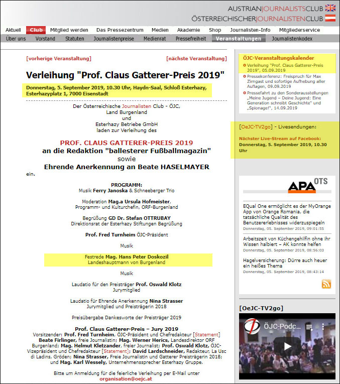 | Was für Stümper ... beim sog. Österreichischen Journalisten Club! [06.09.2019] Gestern also begaben sich die alten Herren vom Österreichischen Journalisten Club auf Knien ins Schloss Esterházy in Eisenstadt, um mit dem dortigen Mitfinanzier ihres „Claus-Gatterer-Preises“ dessen Verleihung an den Zweitplatzierten zu …, na, wie sagt man da?, zu zelebrieren. Wochenlang schon war – wenn auch für einen anderen Preisträger – ein Livestream von der Veranstaltung angekündigt. Und es gab auch einen. Aber ohne Ton: 95 Minuten lang. Eine Direktübertragung in alle Welt. Nun ja, drei Zuseher waren live dabei. Drei. Bei dieser unsäglichen Selbstinszenierung, sinnigerweise auch unhörbaren. Mein Hintergrundbericht hat ihnen offensichtlich die Red‘ verschlagen. ![]() Wer vor der Verleihung das Weite gesucht und wohl auch gefunden hat, das war der Festredner: Landeshauptmann Hans-Peter Doskozil. Er ist der Veranstaltung, für die er noch im Juli kräftig geworben hat, schlicht fern geblieben. In letzter Minute. Aus sehr guten Gründen. Schließlich gibt’s bald Neuwahlen zum burgenländischen Landtag. Wenn kritischer Journalismus einen Preis für kritischen Journalismus bekommen soll, sich aber dann zum Preis und seinen Hinterrmännern kritisch äußert, dann wird’s kritisch. Wie man dem Bericht von „Burgenland heute“ (mit Ton!) entnehmen kann, hat der ÖJC aus Beleidigtsein den Preis neu vergeben. ![]() Das wird noch ziemlich heiter werden. Siehe auch: Was dann geschah: Mein Artikel zur Gatterer-Preisverleihung und die Folgen |