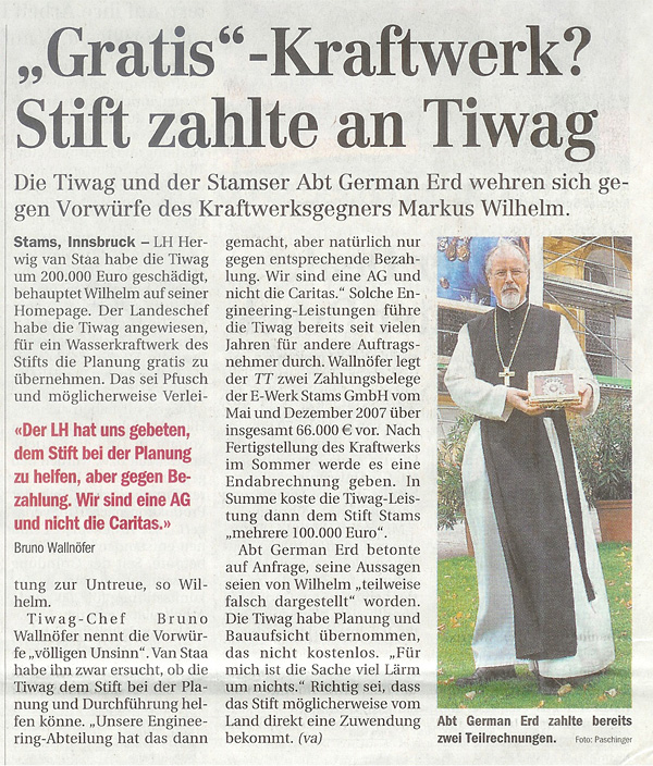 Die TT erwähnt zwei Zahlungsbelege des Stiftes aus dem Jahre 2007 in der Gesamthöhe von 66.000 Euro, legt diese aber wohlweislich nicht vor. Vermutlich handelt es sich dabei auch nur um weiterverrechnete Leistungen Dritter. Der Abt des Stiftes und gleichzeitige Geschäftsführer der E-Werk GmbH hat mir gegenüber mehrfach und von Angesicht zu Angesicht bestätigt, dass „bis jetzt keine Rechnung gekommen ist von der TIWAG“.