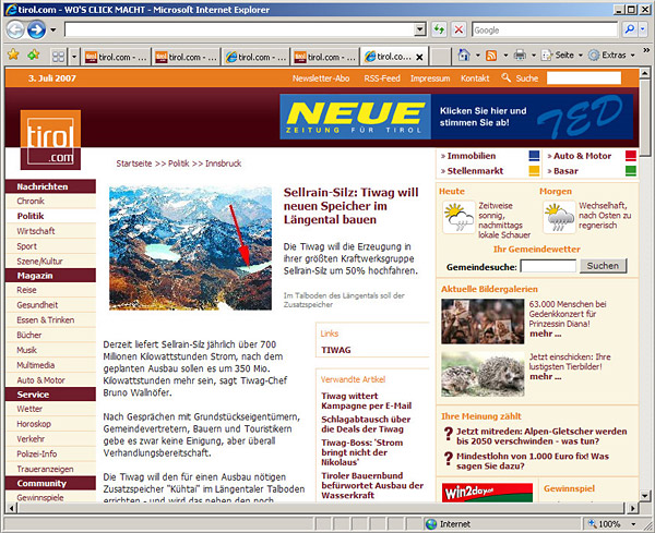 Im Bild eine TIWAG-Presseaussendung als TT-Artikel auf der Internetplattform der Tiroler Tageszeitung "tirol.com ? WO?S CLICK MACHT"