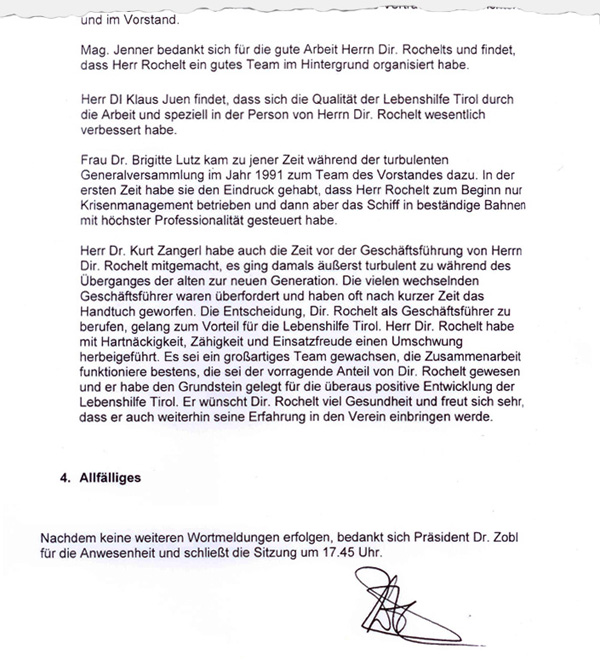 Als Zobl seinen Spezl Rochelt, den Geschäftsführer der GesmbH Lebenshilfe Tirol, im Frühjahr 2007 widerrechtlich mit 150.000 Euro abgefertigt und gleichzeitig mit 5.500 Euro monatlich (für 20 Wochenstunden) als Geschäftsführer beim Verein Lebenshilfe Tirol wieder angestellt hat, haben die Vorstandsmitglieder den Raffzahn Rochelt sogar noch unisono über den grünen Klee gelobt: