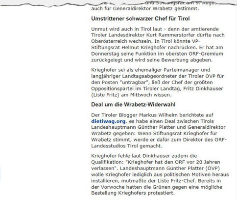 Nach übereinstimmenden Informationen aus dem ORF in Wien soll Günther Platter vor der Wiederwahl von Alexander Wrabetz zum ORF-Generaldirektor mit diesem den Deal abgeschlossen haben, dass der ÖVP-Stiftungsrat Helmut Krieghofer Wrabetz die Stimme gibt und von Wrabetz dafür zum Direktor des ORF-Landesstudios Tirol gemacht wird.