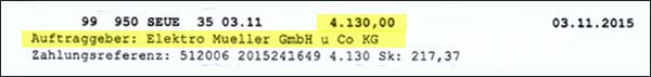 Von diesem „Einnahmenüberschuss“ wurden nach Abzug eines kleineren Betrages wofür auch immer - und: Achtung! - 5 % Skonto (217,37) am 3. November 2015 auch tatsächlich 4.130 Euro auf das Vereinskonto der Kaiserjäger überwiesen. Abgebucht vom Konto der Firma Elektro Müller, dem Arbeitgeber des OTKM-Kassiers Reinhard Auer.