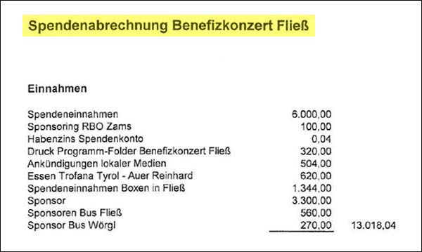 Ein Benefizkonzert ist ein Benefizkonzert, wenn der Überschuss, der sich nach Abzug der Ausgaben von den Einnahmen ergibt, dem Zweck zufällt, für den es veranstaltet wurde. Das „Kirchenkonzert als Benefizveranstaltung zugunsten der Hochwasseropfer in See/Paznaun und Sellrain“ (Einladungstext) am 18. September 2015 in der Barbarakirche in Fließ, wurde jedoch missbraucht, um auch Geld in die Kassa der „Original Tiroler Kaiserjägermusik“ (OTKM) zu schaufeln. Der Überling in Höhe von 4.888,00 wird sogar ganz offen als „Einnahmenüberschuss für OTKM“ deklariert.