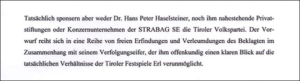 In seiner Klage gegen mich behauptet der von uns mäzensierte Mäzen der Festspiele Erl steif und fest, er habe nichts mit einer Parteienfinanzierung der Tiroler Volkspartei zu tun, mehr noch: Er habe diese niemals gesponsert. Er gibt für dieses Niemals sogar noch eine „Eidesstättige Erklärung“ bei Gericht ab. Dummerweise.