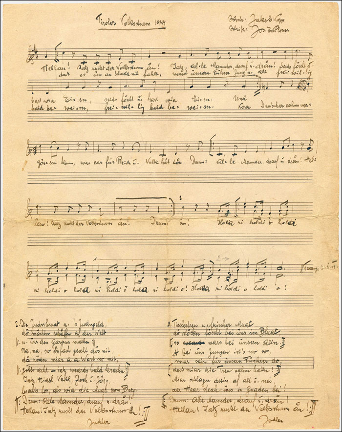 „Mein Glaube an den deutschen Endsieg ist fester denn je“, schreibt Ploner am 23. Oktober 1944 von Tarrenz aus an seinen Musikerkollegen Josef Gasser. Derselben Anschauung ist offenbar auch Jakob Kopp. Nachdem der Gauleiter die Tiroler Standschützen in den Volkssturm eingegliedert hat, hetzt er auch diese noch in den aussichtslosen Krieg.